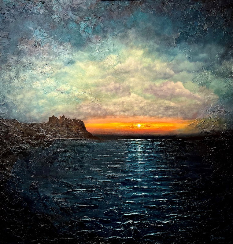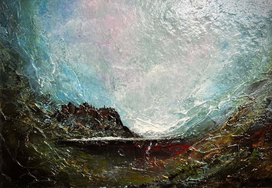 BUY NOW ONLINE!A mythical abstract painting of Dunluce Castle. Mixed medium on laminated hand-made paper. Size: 20 x 29cm. Price: £475 / £47.50 per month.