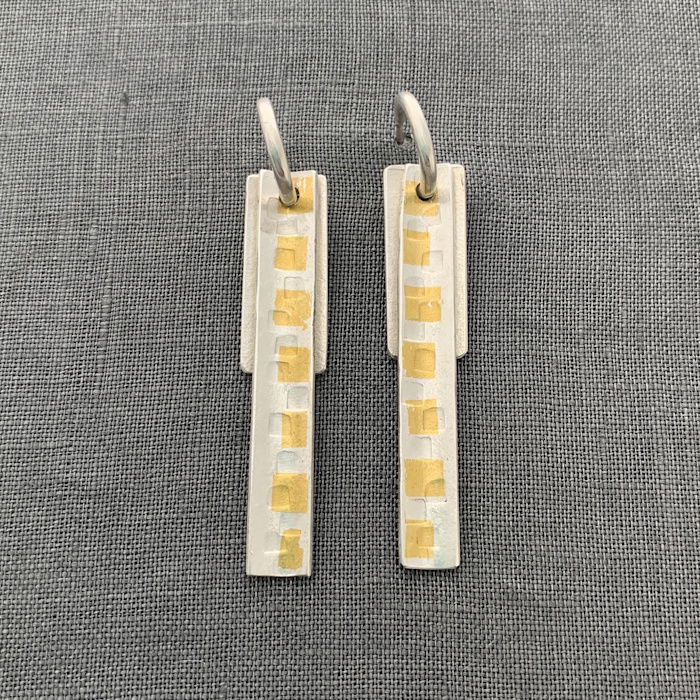 BUY NOW ONLINE!CPM244. Fine silver & gold design hang from silver hoop. Metal textured with various techniques. Price: £120 / £12 per month.