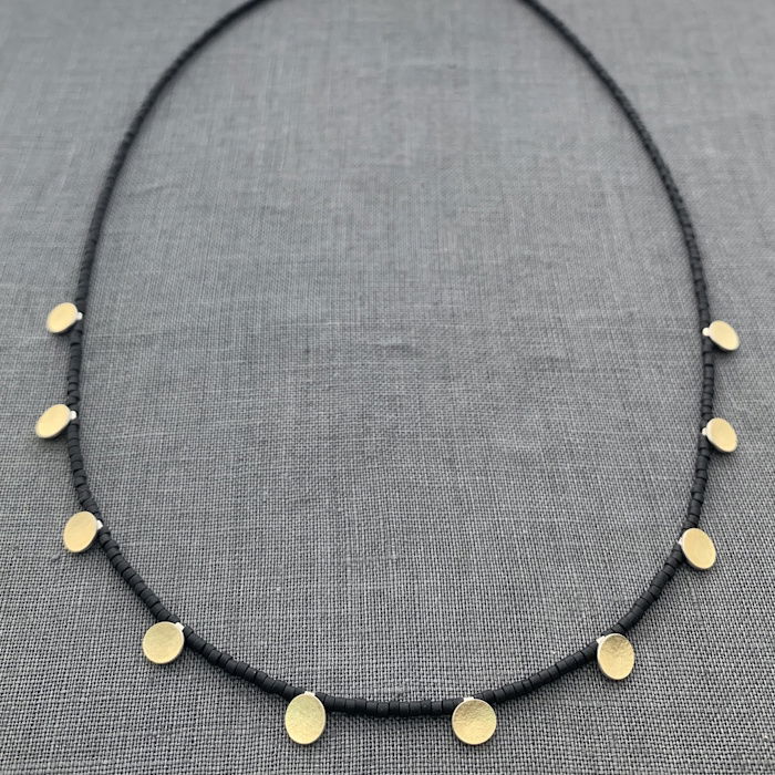 BUY NOW ONLINE!CPM249. Sterling silver w/ 18k gold fused to surface. Discs textured with Japanese paper by rolling paper and metal through jewelers rolling mill. Discs strung with Japanese Seed Beads.17". Price: £220 / £22 per month.